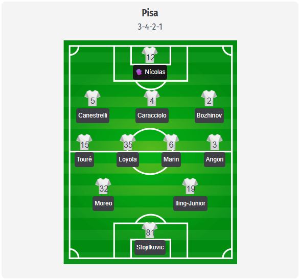Hiljemark is likely to leave Pisa in their usual 3-4-2-1 formation, with Nícolas as the probable starter because Scuffet is still out with muscle problems. The back three should consist of Canestrelli, Caracciolo, and Bozhinov, a setup that tends to secure the penalty area and seek quick clearances rather than defending high up the pitch. Touré and Angori would provide width, while Loyola and Marin would shield the center and play the first ball up front. In front of them, Moreo and Iling Junior seem the most obvious duo for the two supporting roles, with Moreo dropping into the spaces and Iling Junior attacking the far side during Pisa’s transitions. Stojilkovic is planned as the target player up front. Denoon is still out with an ankle problem, so Calabresi, Coppola, or Albiol could be the main alternatives for the defense. If more creativity is needed on the ball, Tramoni or Stengs could come in as playmakers behind the striker.