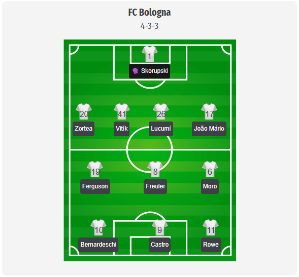Italiano is likely to stick with his usual system of four defenders, three midfielders, and three attackers, with Skorupski behind a back four of Zortea, Vitík, Lucumí, and João Mário. The forecast is mainly influenced by the absences on the left side: Miranda is out, Lykogiannis is still unavailable, and Heggem is also unavailable. This makes Casale the most likely backup if rotation is necessary. When in possession, the full-backs are likely to push forward consistently. In midfield, Freuler should provide cover, Moro should be responsible for the first ball, and Ferguson should act as a runner. This fits in with Italiano’s pressing and quick ball wins. Up front, Bernardeschi is set to play on the right as a creative player after his recent winning goal from the penalty spot, with Rowe providing depth on the left and Castro leading the line. Skorupski’s heroics in the Europa League underline his value. Dallinga and Orsolini look like the most important substitutes when the front three need fresh legs.