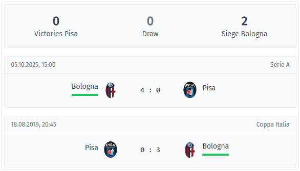 • The most recent head-to-head matches ended 4-0 (2025) and 3-0 (2019) in favor of Bologna; with Pisa’s three goalless draws in five games, “Both teams to score: No” and Bologna to keep a clean sheet seem obvious.