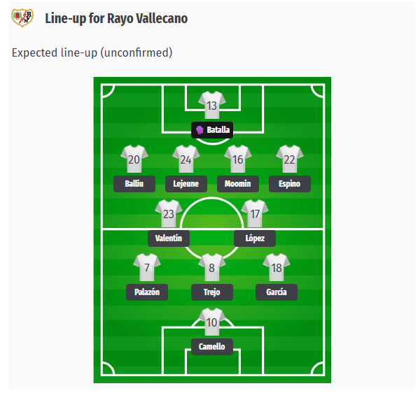 Coach Iñigo Pérez is likely to return to the tried-and-tested 4-2-3-1 formation for the home game against Real Madrid. Batalla will be in goal, with Balliu, Lejeune, Mumin, and Espino forming the back four. Valentín and López are expected to play in central midfield. Palazón, Trejo, and Álvaro García could form the attacking trio, with Camello leading the line. Pérez reacted at half-time in the Conference League game with four substitutions that turned the game around. Players such as De Frutos and Rațiu, who were dropped from the starting lineup at the time, bring fresh momentum and are likely to be important options off the bench against Madrid. With no significant injury concerns, the coach has a full squad to choose from. The depth of the squad could be decisive, especially as the team suffered a heavy 4-0 defeat at Villarreal after three consecutive league wins.
