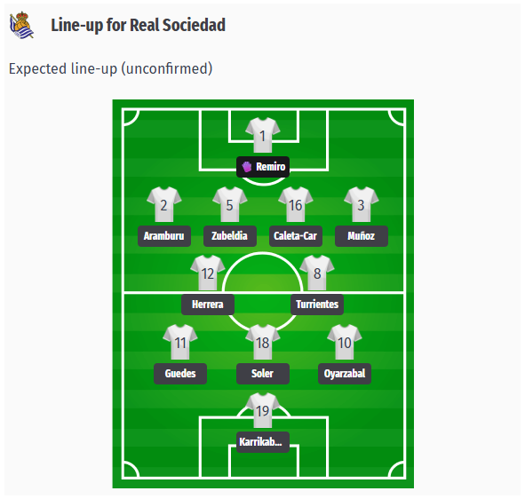 Karrikaburu would start at center forward, having impressed in Vigo with his runs and creating space for Oyarzabal. Alternatively, Soler or Zakharyan are available options, both in good form and capable of filling the offensive void left by Kubo.