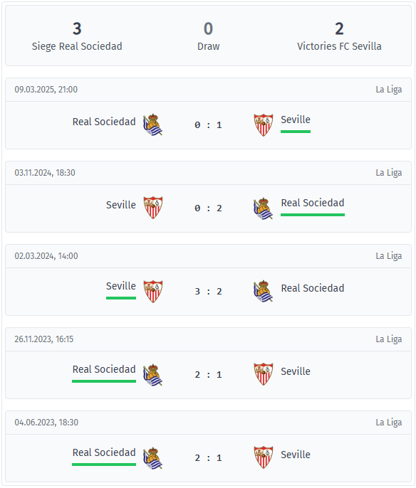 The record of the last five encounters is balanced: Real Sociedad won three games, Sevilla two, and there were no draws. The last meeting in March ended 0-1 for Sevilla, while in November 2024, Real Sociedad won 2-0 away.