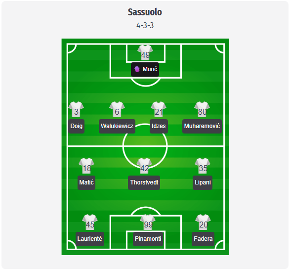 Sassuolo are expected to line up in their familiar 4-3-3 under Grosso, with Murić in goal and a back four of Doig, Walukiewicz, Idzes, and Muharemović. In midfield, the forecast points to Matić as the defensive midfielder, supported by Thorstvedt and Lipani as the two central midfielders, a lineup that allows for both physical presence and late runs from Thorstvedt, who scored in the recent draw against Parma. Up front, the predicted trio sees Laurienté on the left, Fadera on the right, and Pinamonti as the central target man. This is a speculative lineup, not an official one, and details may change, especially as key players such as Berardi and Volpato remain sidelined, while defensive options such as Pieragnolo, Paz, and Coulibaly are also out.