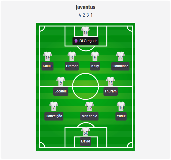 In line with our prediction, Juventus should start in a 4-2-3-1 formation under Spalletti, very similar to the game against Lecce, with Di Gregorio in goal, Kalulu, Bremer, Kelly, and Cambiaso in front of him, and Locatelli and Thuram as double sixes. It could be that one of McKennie, Conceição, or Yıldız will be rotated, but our prediction leaves all three behind David. It remains a predicted lineup, not an official one, but the structure is likely to remain unchanged and the team is expected to stick with the formation it normally plays. In defense, Gatti and Rugani are unavailable, so Bremer and Kelly should continue in the center. Up front, injuries to Vlahović and Milik mean David remains the starter, with Openda the first replacement option and Kostić or Zhegrova the wing alternatives.