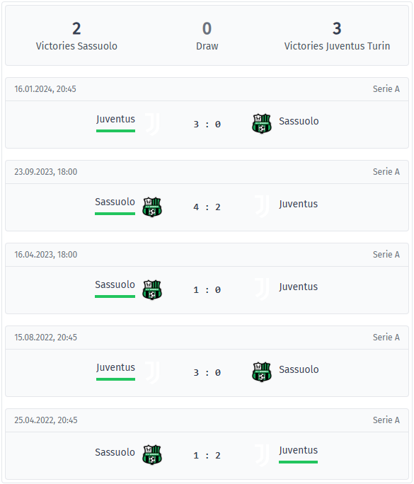 Juventus leads the head-to-head record in the last five Serie A meetings, with three wins to Sassuolo’s two, and there has not been a single draw, with each game having a clear winner. Juventus were ruthless in Turin, winning both home games 3-0, while in Emilia the balance is more even, with two Sassuolo wins and a narrow 2-1 victory for Juventus. In these five encounters, the matches were relatively open overall, with a total of 16 goals, 10 for Juventus and 6 for Sassuolo, averaging 3.2 per game, and four of the five games ended with more than 2.5 goals. There was also a series of three games between 2022 and 2023 in which each match remained under 3.5 goals before Sassuolo’s 4-2 win broke that pattern. In terms of tempo, these games usually reach their peak before the break, with at least two goals scored in the first half in four of the five games, while the second 45 minutes were much tighter, with under 1.5 goals in four of them and in three consecutive encounters during 2022 and 2023. Juventus scored in both halves in most of the matches, and one might think that Sassuolo’s defense will struggle if the game opens up early.