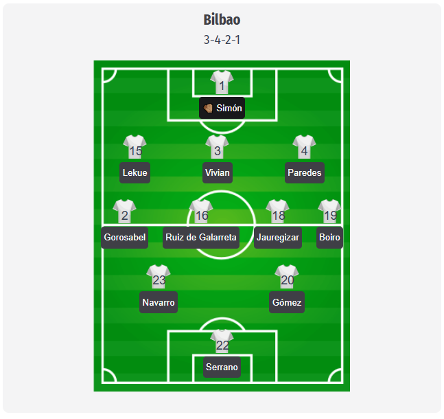 Valverde is likely to opt for a 3-4-2-1 formation, with Simón behind a back three of Lekue, Vivian, and Paredes. Gorosabel and Boiro will provide width as wingbacks, while Ruiz de Galarreta and Jauregizar will dictate the tempo in the center. In front of them, Navarro and Gómez could repeatedly cut inside as creative minds, with Serrano leading the press up front. The absences determine the options: Álvarez continues to serve a suspension across all competitions, Egiluz is out with a cruciate ligament rupture, and Prados is not eligible to play in the Champions League. Most recently, reports have also mentioned problems with Berenguer, Nico Williams, Berchiche, and Iñaki Williams, as well as injuries to Laporte and Sannadi. Interestingly, Athletic may therefore have to rely more on organization and counterattacks to win games.