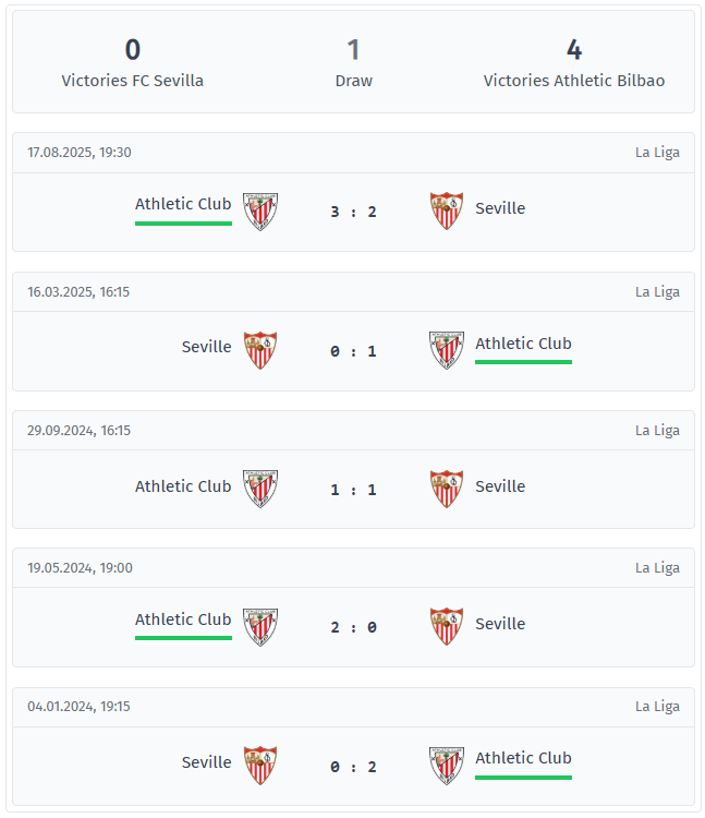 - The head-to-head record clearly favors Athletic: unbeaten in five league games, scoring in all five, Sevilla always conceding goals; the visitors often take an early lead, while Sevilla have failed to score before the break.