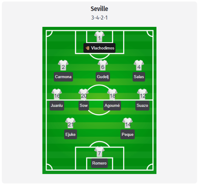 In the half-spaces, Ejuke and Peque could operate around Romero, giving Sevilla plenty of speed on the counterattack. Adams, Ejuke, and Sow are back, but the absences continue to hurt: Marcão is serving a six-game La Liga suspension, and Azpilicueta and Nianzou are also out, so Gudelj will likely have to shore up the back three. Further up front, Sánchez, Vargas, Januzaj, and Alfon are still missing, and Mendy is suspended, leaving Adams as the most likely option to make an impact later on.