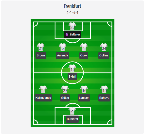 This is only a prediction, but Frankfurt are likely to stick close to their usual structure and probably line up in a 4-1-4-1. Zetterer should start behind Brown, Amenda, Koch, and Collins, while Skhiri covers the midfield. In front of them, Larsson and Götze would be the main playmakers, while Bahoya and Kalimuendo Burkardt are expected to support them with direct runs. Availability has a noticeable impact on this prediction. Kauã Santos remains sidelined, and with Theate and Kristensen out defensively, Brown and Collins are the most likely options at full-back alongside Koch and Amenda. Uzun, Knauff, and Batshuayi are also missing further up front, so Götze could take on even more creative responsibility in a team that Riera is unlikely to fundamentally reshuffle.