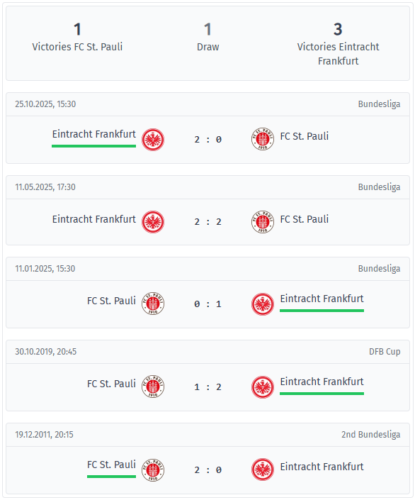 The most recent head-to-head matches clearly favor Frankfurt. They have won three of the last five encounters, with one draw and one win for St. Pauli, the most recent result being a 2-0 home win in October 2025. Before that, there was a 2-2 draw in May 2025 and a 1-0 away win in January 2025, so St. Pauli clearly had problems winning this duel. Two longer patterns are also noticeable. None of these five games were tied at halftime, and fewer than 1.5 goals were scored in the second half each time, suggesting that these are often games that are decided early on and then controlled. It is also telling that the last three encounters all ended with fewer than 3.5 goals, even when Frankfurt had the upper hand.