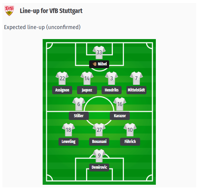 Chris Führich, Jamie Leweling, and possibly Badredine Bouanani are expected to play in attacking midfield. Angelo Stiller and Atakan Karazor would form the central double six, with Stiller certainly looking to bounce back after his costly mistake in Basel. Alexander Nübel will be between the posts.