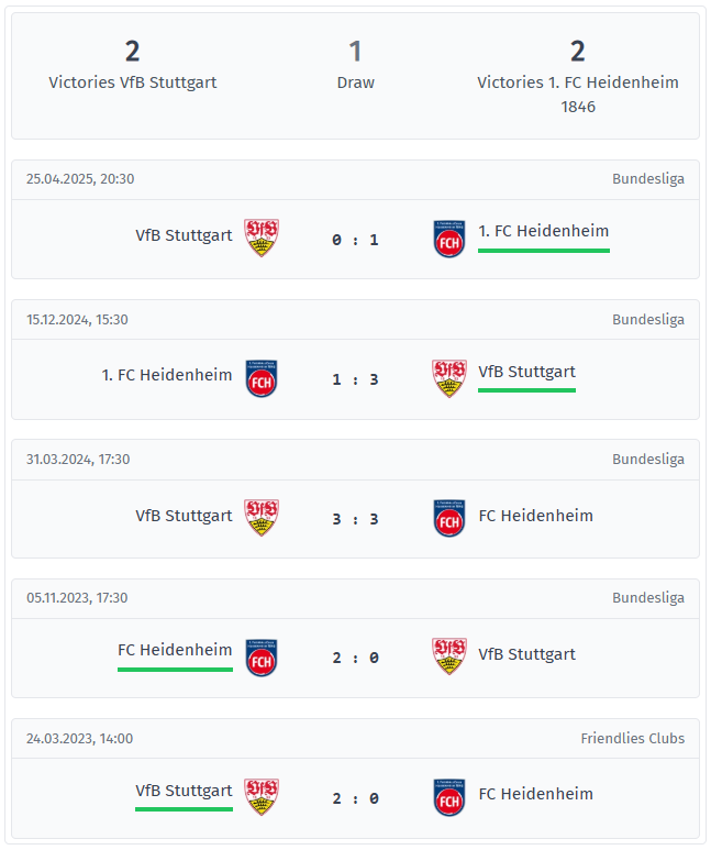 After a 2-0 friendly win in March 2023, Heidenheim initially dominated with a 2-0 home win in November 2023. The spectacular 3-3 draw in March 2024 showed both teams at their most offensive. The two most recent Bundesliga matches reflected the home advantage. Stuttgart won 3-1 away in December 2024, while Heidenheim responded with a narrow 1-0 victory in April 2025. Stuttgart are likely to still be smarting from that defeat.