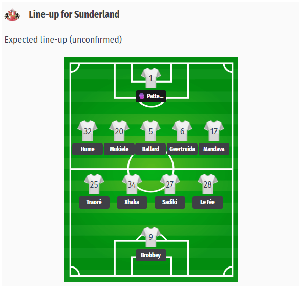 Coach Régis Le Bris is expected to field a five-man defense: Patterson in goal, Hume, Mukiele, Ballard, Geertruida, and Mandava in defense. In midfield, Xhaka could play as an experienced anchor alongside Traoré, Sadiki, and Le Fée. Brobbey will play as the lone striker. According to Opta, the club currently has no injuries, although 454 days have been lost to injuries so far this season, giving Le Bris a full selection for the starting lineup. The signing of Xhaka has apparently been well received, with David Moyes recently praising him as the “second coach” on the pitch. Rigg, Neil, Adingra, and Isidor are expected to be on the bench, among others.