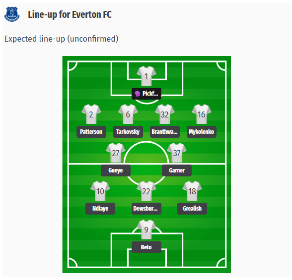David Moyes is expected to stick to his tried-and-tested 4-2-3-1 formation and not take any risks. No new injury concerns have been reported, with only Merlin Röhl still out with a hip injury and his return uncertain. Jordan Pickford is expected to start in goal. The back four is likely to consist of Patterson, James Tarkowski, Michael Branthwaite, and Vitaliy Mykolenko. Idrissa Gueye and Josh Garner will form the defensive midfield duo. The attacking trio will consist of Saja Ndiaye, Harry Dewsbury-Hall, and Jack Grealish. Beto will start as the lone striker, with 22-year-old Barry available as an alternative, but he still needs time to adapt. The lineup will only be officially confirmed shortly before kickoff.