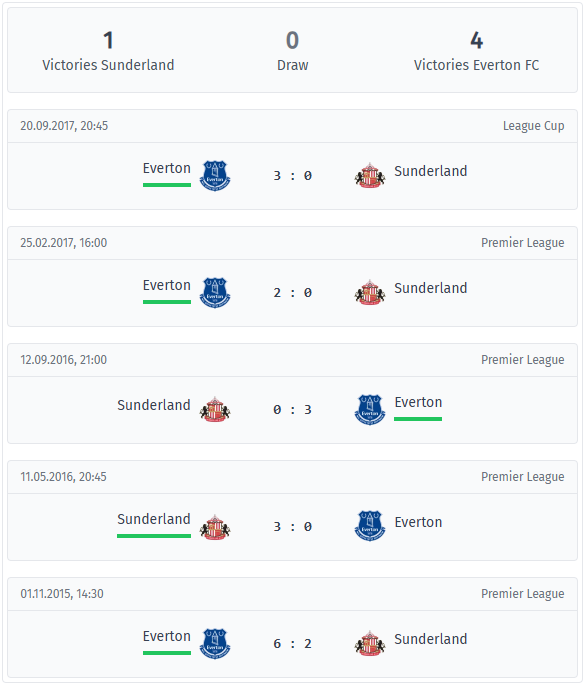 The head-to-head record clearly favors Everton: the Toffees have won four of the last five meetings, with Sunderland winning only once. However, the most recent match dates back to September 2017, when Everton won 3-0 in the League Cup. The goal tally in these matches is remarkable, as all five games were high-scoring with at least three goals, and four of the five games even saw more than 2.5 goals. The most spectacular result was a 6-2 win for Everton at Goodison Park in November 2015. Sunderland’s only home win in this series came in May 2016, when they won 3-0 at the Stadium of Light. Sunderland often failed to score, and many games were already decided by halftime. There has not been a single draw in this series.