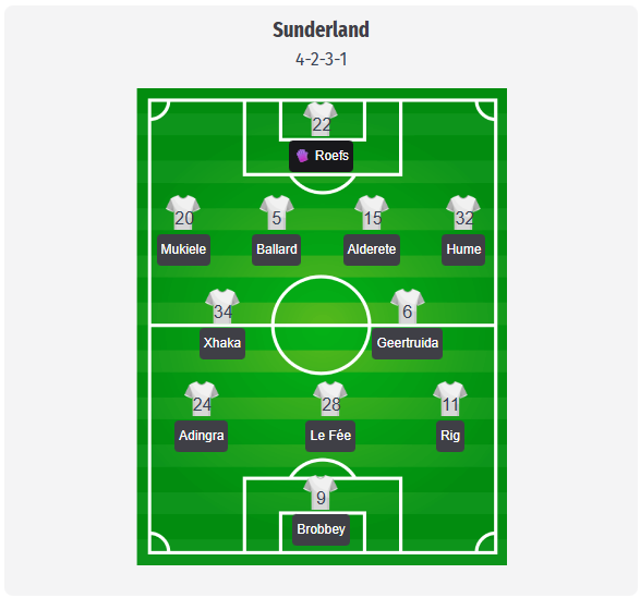 Sunderland are expected to stick with their now familiar 4-2-3-1 formation, with Roefs continuing in goal after his strong first half of the season. In front of him, a back four of Mukiele, Ballard, Alderete, and Hume is likely to start, with Xhaka and Geertruida expected to form the double six, ahead of Adingra, Le Fée, and Rigg, who will support Brobbey as center forward. This is a predicted lineup, not a confirmed starting XI.