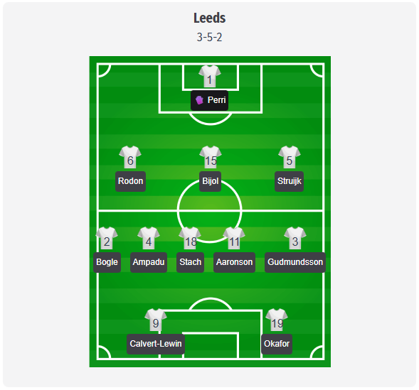 Leeds are expected to stick with Daniel Farke’s now familiar 3-5-2 formation, with our predicted lineup seeing Perri behind a back three of Rodon, Bijol, and Struijk. Bogle and Gudmundsson will provide width on the flanks, Ampadu will play the deepest role in midfield, while Stach and Aaronson can focus on second balls and attacking set pieces, which remain one of Leeds’ most important weapons. Up front, Calvert-Lewin and Okafor are likely to continue as the attacking duo, mainly due to Calvert-Lewin’s current scoring form. Longstaff and James are out, which limits the options in midfield and on the wings. Nmecha is working his way back from a thigh injury and, despite speculation about a return, remains on the fringes of the squad in this prediction, leaving Harrison, Gnonto, and Piroe as the most likely options off the bench.