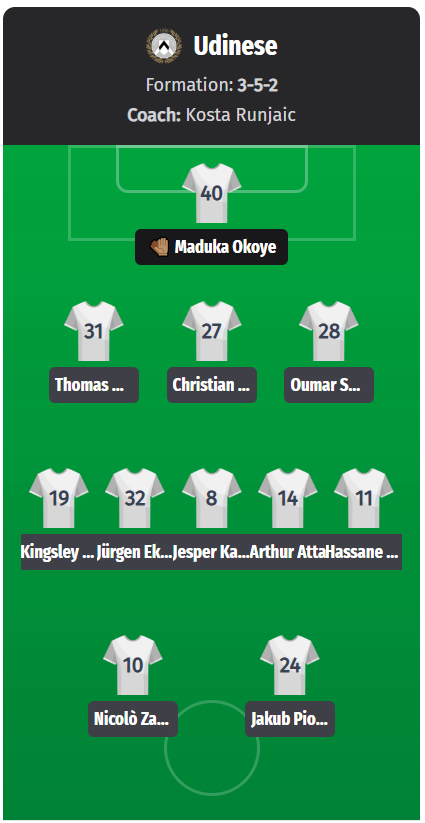 • Udinese is missing three defensive players—Zemura, Zanoli, and the questionable Okoye—which significantly weakens the back line under Runjaić.