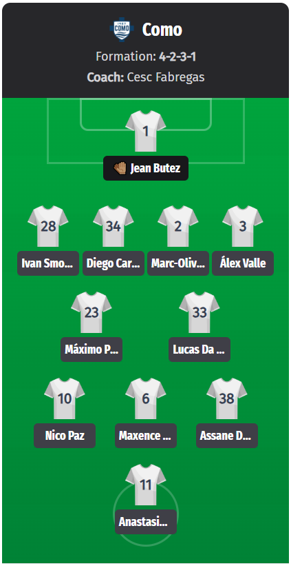 Five competitive matches without a loss, including wins against Lecce, Cagliari, Roma, and Pisa in the league. The scoreless Coppa Italia semifinal against Inter also proved that they can play with defensive discipline when needed. With only Jacobo Ramón, Jesús Rodríguez, and Jayden Addai sidelined, Cesc Fàbregas has enough options to keep the tempo high.