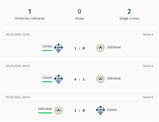 • Como won the first leg 1-0 in January 2026 and is the clear favorite, having gone five competitive matches without a loss, although away games at Udinese tend to be closer.