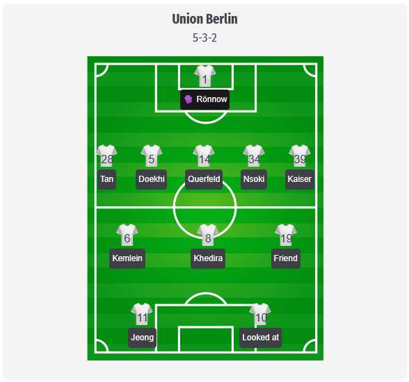Union are expected to stick with a 5-3-2 system, with our predicted starting lineup seeing Rönnow in goal behind a back five of Trimmel, Doekhi, Querfeld, Nsoki, and Köhn. In front of them, Kemlein, Khedira, and Haberer would start in midfield again, with Jeong and Ansah up front. This formation is supposed to provide more security after the recent defensive problems that Trimmel and Rönnow have openly addressed, but it is clearly a projection and not a confirmed selection. With Markgraf still out with a stress fracture and both Skov and Bogdanov unavailable, our projection relies on Köhn and Jeong for width and Ansah’s mobility rather than a classic center forward. From the bench, Schäfer and Král seem most likely to change the rhythm in midfield, while Burke or Ljubicic could be brought on if Baumgart is looking for more punch up front.
