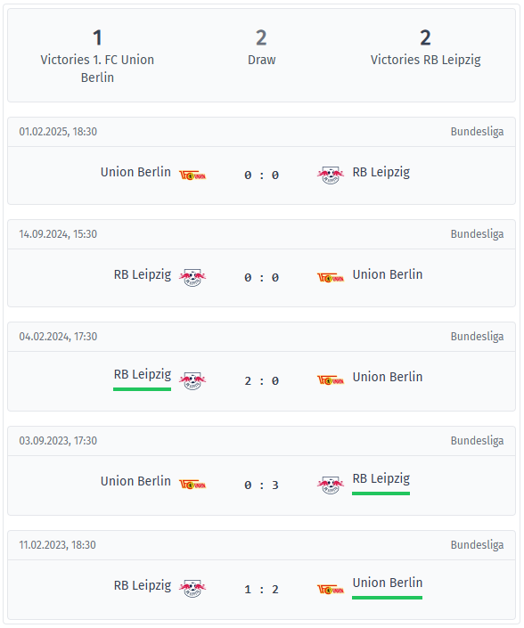 In the last five Bundesliga encounters, RB Leipzig leads the mini-series with two wins, two draws, and one defeat. Union Berlin’s only success in this period dates back to 2023 and came away at Leipzig. Since then, Leipzig has won twice and the teams have shared two goalless draws. The scores were mostly close overall, with all five games ending with fewer than four goals in total, three of which produced at least two goals. The most decisive result came in 2023, when Leipzig won 3-0 in Berlin, followed by a 2-0 home win in 2024, but often neither team was able to pull away, making individual mistakes and set pieces particularly influential. The first halves followed a remarkably consistent pattern, with all five encounters seeing less than one and a half goals in the opening period and Union failing to score before the break in any of them. Leipzig did not concede a goal in any of these first halves, so the games usually only opened up after the break, when legs became tired and space opened up. From 2023 to early 2024, there was a series of three games in which Leipzig scored in each match and Union conceded a goal in each, all with at least two goals in total. Since then, the tide has turned again with consecutive 0-0 draws in 2024 in Leipzig and in February 2025 in Berlin. The venue was not a decisive factor, even though Leipzig performed slightly better in Berlin, with a win in 2023 and a draw in February 2025, while Union’s only success in this series came away in Leipzig. Perhaps the psychological advantage weighs less here than the first goal, as the statistics suggest that it is particularly difficult to catch up in this duel.