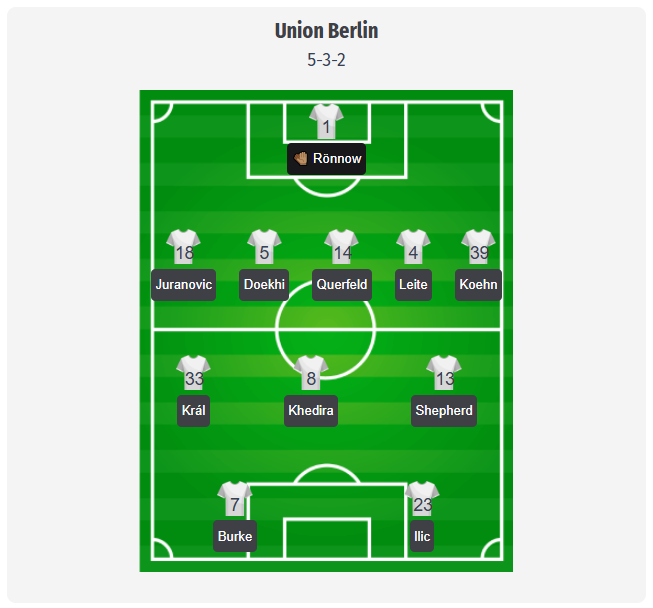Union Berlin is expected to line up in a 5-3-2 under Marie-Louise Eta, though this is a prediction, not a confirmed starting lineup. The likely back five in front of Frederik Rönnow, with Josip Juranovic (18) and Derrick Köhn (39) as wing-backs, would fit Eta’s earlier call for defensive compactness, intensity, and strong tackling. In this scenario, Danilho Doekhi (5), Leopold Querfeld (14), and Diogo Leite (4) would form the central midfield trio, with Alex Král (33), Rani Khedira (8), and András Schäfer (13) behind them in midfield. Oliver Burke (7) and Andrej Ilic (23) are slated to be the striking duo. With Matheo Raab, Robert Skov, and Woo-yeong Jeong sidelined, the signs point more toward personnel continuity than a major shake-up.