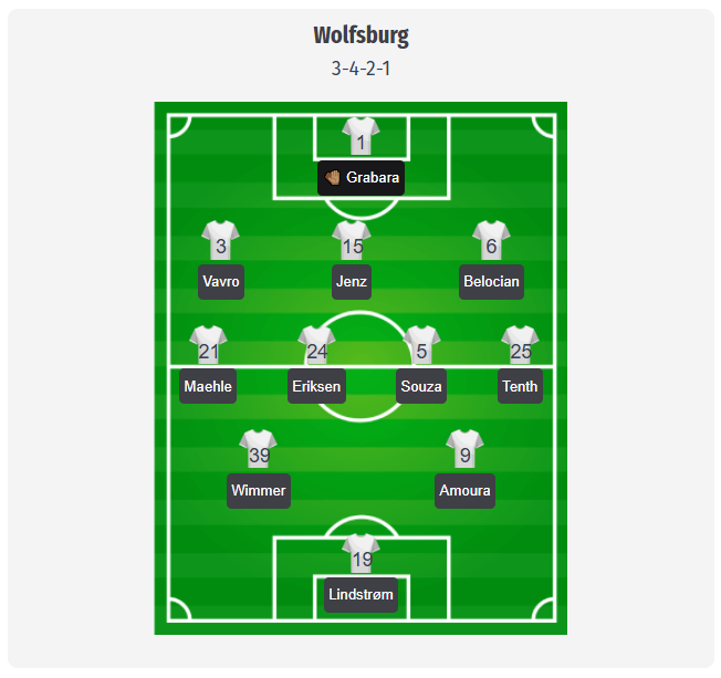 Wolfsburg is likely to stick with the 3-4-2-1 formation without making major tactical changes. In this lineup, Kamil Grabara sits behind a back three of Denis Vavro (3), Moritz Jenz (15), and Jeanuël Belocian (6), while Joakim Maehle (21) and Aaron Zehnter (25) provide width as wingbacks. The bigger personnel questions arise further up the field. Jonas Wind and Mattias Svanberg remain sidelined, and there is a question mark over Maximilian Arnold due to groin issues, which is why Christian Eriksen (24) and Vini Souza (5) could anchor the midfield. Up front, Patrick Wimmer (39) and Jesper Lindstrøm (19) appear to be the most likely partners for Mohamed Amoura (9), though this is a projected, unconfirmed lineup.