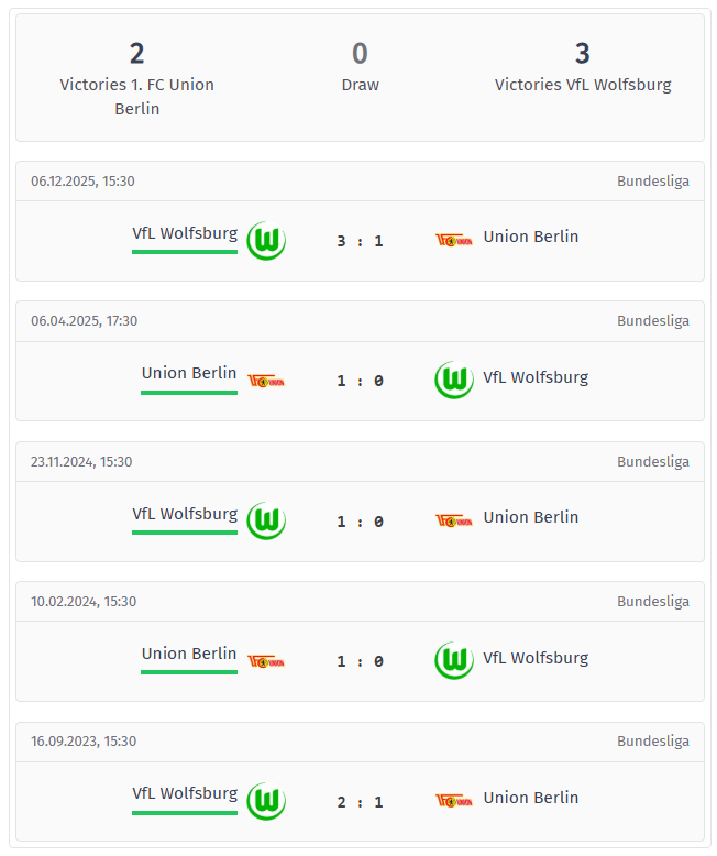This matchup has been strikingly one-sided recently: There hasn’t been a single draw in the last five league encounters. Wolfsburg won three of them, including a 3-1 home victory in December 2025, while Union came out on top twice, both times in Berlin, with a 1-0 win in April 2025 and another 1-0 victory in 2024. The results themselves also speak volumes. Four of the last five matches saw fewer than 3.5 goals, and the second halves in particular were low-scoring, with fewer than 1.5 goals after the break in four consecutive matches. The history of these two teams has generally been more controlled than chaotic.