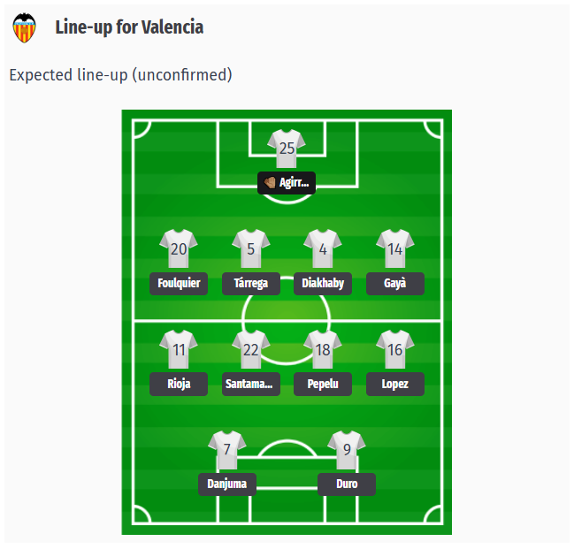 Valencia are expected to line up in their usual 4-4-2 formation. Coach Carlos Corberán is likely to stick with what has worked, as the system has stabilized in recent weeks. We expect Agirrezabala in goal, while the back four could consist of Foulquier, Tárrega, Diakhaby, and Gayà. The midfield will be interesting to watch. Santamaría and Pepelu could form the central axis, supported by Rioja and López on the wings. In attack, I expect Danjuma and Duro to form the strike partnership. This lineup would give Valencia the necessary balance between defensive stability and attacking power that Corberán prefers.