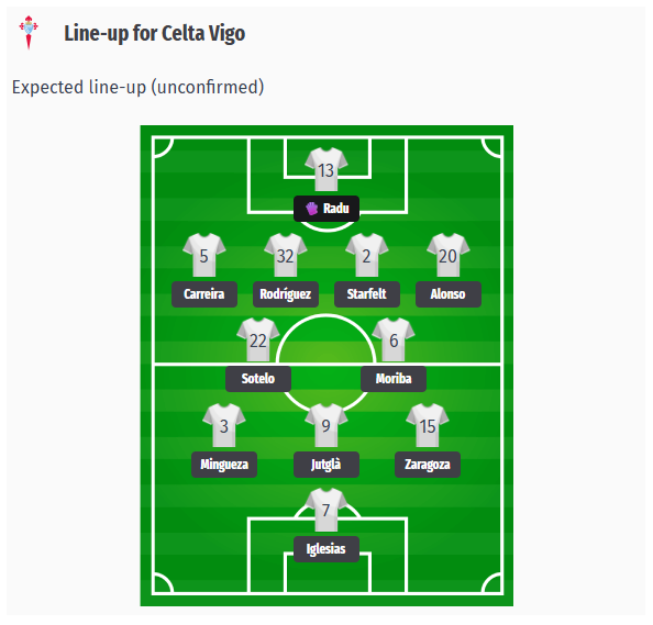 Coach Claudio Giráldez will probably stick with his tried-and-tested 4-2-3-1 system. Ionuț Radu could be fit in time to start in goal despite his hand injury. The back four is likely to consist of Carreira at right-back, Stafelt and Javi Rodríguez in central defense, and Marcos Alonso at left-back.