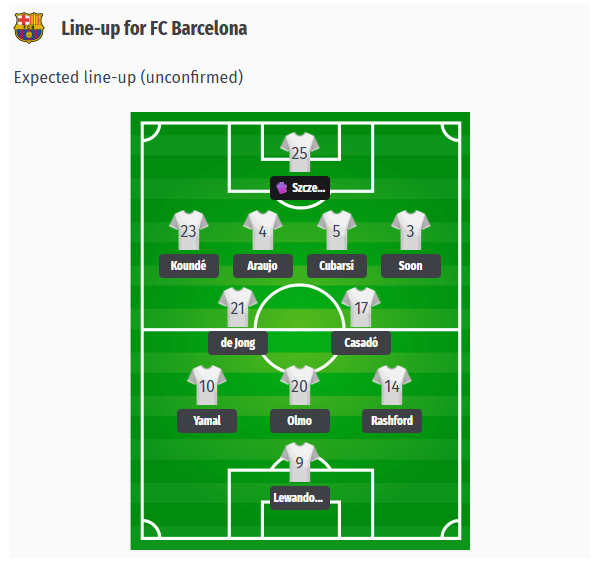 Barcelona are expected to line up in a 4-3-3 formation. The exact line-up still needs to be verified due to inconsistencies in the original text. Robert Lewandowski and Dani Olmo are certain to return, while Raphinha, Pedri, Gavi and both regular goalkeepers remain sidelined.