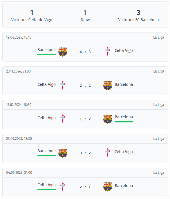 Both teams scored consistently: Celta scored at least once in all five games, but also conceded at least one goal in each game. The same applies to Barcelona, who were dangerous in front of goal but vulnerable defensively. Celta’s last home win against Barcelona dates back to June 2023, when they won 2-1. The most recent meeting in November 2024 in Vigo ended in a 2-2 draw, with Celta having lost twice narrowly away from home before that.