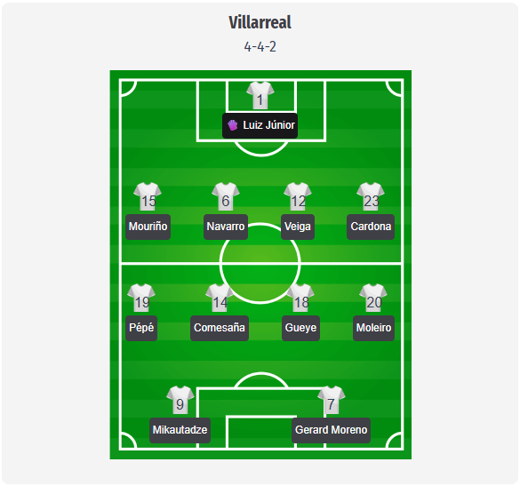 Villarreal are likely to stick with Marcelino’s usual 4-4-2, although this is more of a prediction than a confirmed starting lineup. In this formation, Comesaña and Gueye would give the team balance in midfield, while Pépé and Moleiro could provide width alongside Mikautadze. Of particular interest is Moreno, who could return straight to the front line after his recent muscle injury. Defensively, this projected lineup suggests Navarro and Veiga in the center, with Cardona on the left and Mouriño on the other full-back position. Foyth remains a notable absentee, Kambwala has not yet been cleared to play, and Pérez is also missing, so Marcelino could deliberately keep the structure simple and rely on well-rehearsed moves rather than major changes.