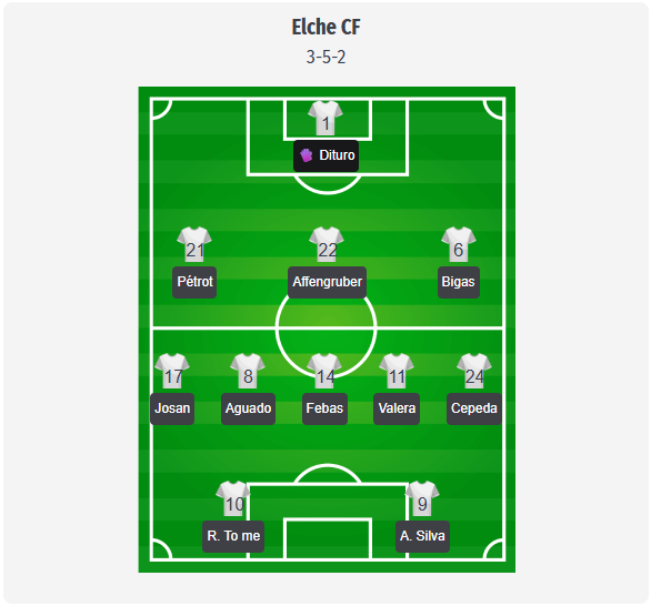 At Elche, Sarabia is likely to field his usual 3-5-2 formation, although this is more of a prediction than a confirmed starting lineup. Dituro should start behind a back three of Pétrot, Affengruber, and Bigas, while Aguado and Febas are expected to provide cover in midfield and Valera link up with the forwards. The most difficult decision could be on the right side. Josan, who recently returned from injury, is slightly favored for this role, while Tete Morente and Sangaré are alternatives if Sarabia wants a different profile. In attack, Mir and Silva seem the most likely duo, and Fort’s shoulder injury leaves Elche with one less defensive option.