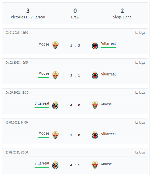 Villarreal – Elche CF Head-to-head & Statistics