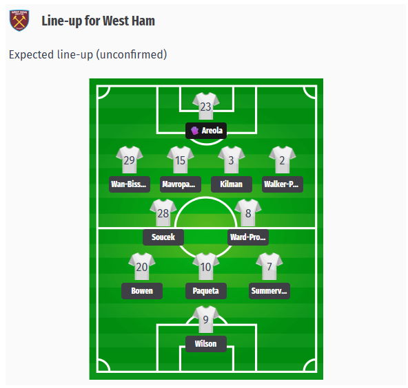 West Ham is expected to line up in Nuno Espírito Santo’s 4-2-3-1 formation. Areola will be in goal, with Wan-Bissaka, Mavropanos, Kilman, and Walker-Peters likely to defend in front of him. Souček and Ward-Prowse could form the double six. Bowen, Paquetá, and Summerville are expected to form the attacking triangle behind the striker, with Wilson as the only experienced striker available due to Füllkrug’s injury. Rumors of a possible winter transfer for Joshua Zirkzee are currently having no impact on the squad.