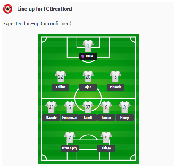 Coach Keith Andrews is likely to stick with his usual 3-5-2 formation. Kelleher, who recently made headlines with his impressive penalty save rate, is expected to start in goal. Collins, Ajer, and Pinnock should form the back three. Kayode is planned for the right wing and Henry for the left, while Henderson, Janelt, and Jensen could provide stability in the center. Andrews is likely to rely on Schade and Thiago in attack. Nelson and Nunes are available again after playing for the U21s, but will probably start on the bench. The bitter loss of new signing Milambo has already been mentioned. Hickey is not yet ready to play after taking a knock in an international match, although he is already back in training. Andrews has plenty of alternatives on the bench in Carvalho, Lewis-Potter and Damsgaard.