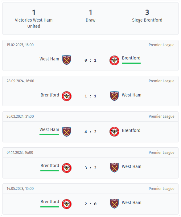 The historical record clearly favors Brentford: three wins, one draw, and only one defeat in the last five games. West Ham last lost at home in February 2025, 0-1. Brentford’s accuracy in these matches is remarkable, scoring at least one goal in all five games, often before halftime. West Ham conceded at least one goal in each of these matches. The games have mostly been high-scoring: four out of five games ended with more than 1.5 goals, three of which had already exceeded this mark at halftime. Only the 1-1 draw in September 2024 was an exception. These statistics reinforce the expectation of an offensive-minded game with a high probability of goals on both sides.