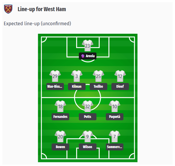West Ham are expected to start with their usual 4-3-3 formation. Kilman and Todibo will form the central defense, with Wan-Bissaka on the right and Diouf on the left. Alphonse Areola will be in goal.