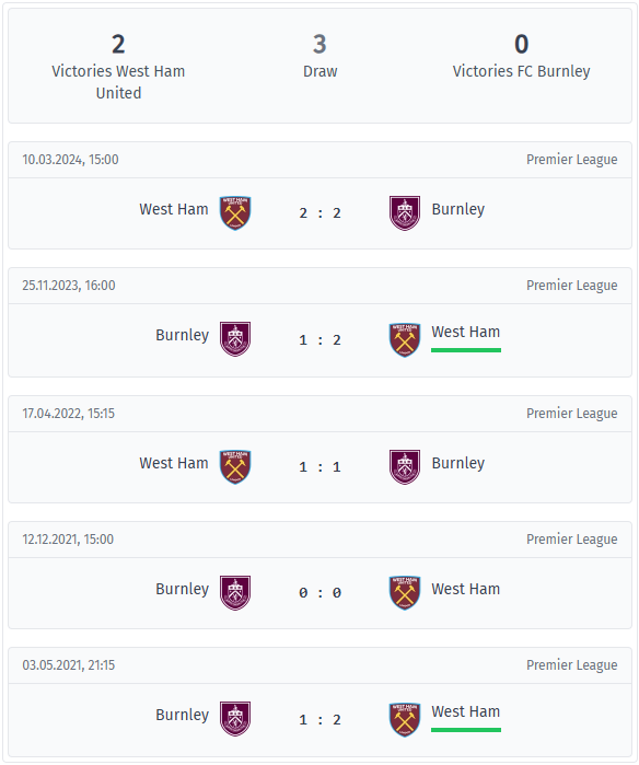 West Ham are unbeaten in their last five meetings with Burnley, with two wins and three draws. In November 2023, West Ham won 2-1 in Burnley, in March 2024 the game at London Stadium ended 2-2, in April 2022 it was 1-1, in December 2021 it was 0-0, and in May 2021 West Ham won 2-1 away.