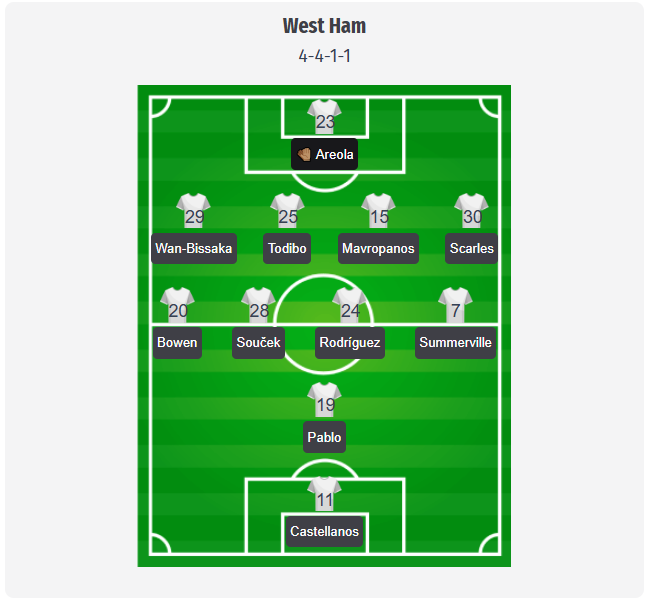 West Ham are likely to line up in a 4-4-1-1, with Areola behind Wan-Bissaka, Todibo, Mavropanos, and Scarles. In this expected formation, Bowen and Summerville would start on the wings, with Souček and Rodríguez in the center. Pablo could play behind Castellanos, linking attacks and triggering the initial pressing. Rodríguez is likely to provide cover, with Souček repeatedly pushing past him. One clear factor is Paquetá, who, according to Nuno, will not be in the squad, so creativity will have to come from Bowen’s direct runs and Summerville’s one-on-ones. Fabianski remains sidelined with a back injury, so Areola is likely to start. If more control is needed, Ward Prowse is the most likely change in midfield, while Wilson looks like a strong option for the final stages.