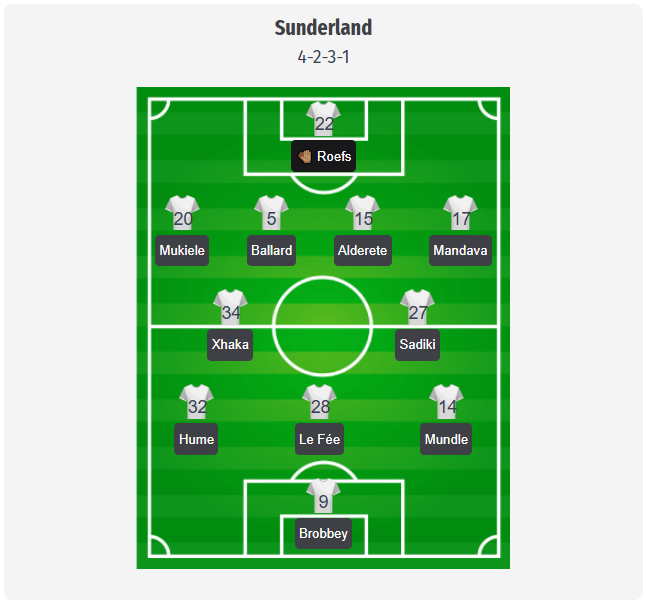 Sunderland comes to London in a solid position in the table, ninth with 33 points and a balanced goal difference, level on points with Newcastle above them and just one point ahead of Everton below. For a promoted side with a relatively modest salary structure, that’s better than most expected. Their recent run has been solid rather than spectacular, with too many draws to fully capitalize on it. Their recent performances show both their resilience and their limitations. They beat Crystal Palace 2-1, with Le Fée’s equalizer bringing calm, and Brobbey completing a comeback after the break that felt deserved. Before that, there was a 1-1 draw at Tottenham and a disciplined 0-0 draw against Manchester City, both neatly controlled but lacking any real punch up front. The outlier was the 3-0 win at Brentford, where they were caught out by carelessness. Across competitions, the FA Cup win at Everton on penalties, after a 1-1 draw and a 0-3 shootout, showed a lot of composure and a reliable goalkeeping performance under pressure. The patterns are clear in the numbers, with 80% of the last five games having under 1.5 goals at halftime, and the same for the second half, yet 80% ended up with over 1.5 goals, often because Sunderland conceded. With no injuries reported, Le Bris can focus on tightening control and moderating Isidor’s smaller role behind Brobbey amid the transfer frenzy.