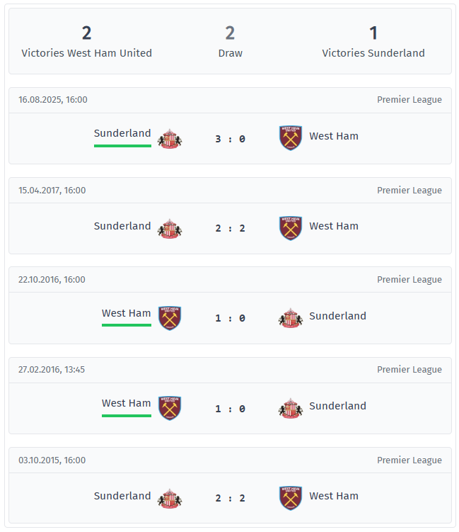 In the last five encounters, West Ham have won 2, Sunderland 1, with 2 draws. The goals are almost evenly balanced, with West Ham scoring 6 and Sunderland 7, although the most recent encounter in August 2025 significantly shifts the picture with a 3-0 win for Sunderland. Before that, four games in a row were close, including two 2-2 draws. The two West Ham wins in 2016 both ended 1-0. If you exclude August 2025, the older sample from 2015 to 2017 makes it look as if West Ham were difficult to beat, unbeaten in four games, with two wins and two draws. Both wins were 1-0, which suggests set pieces or a single moment rather than sustained pressure over 90 minutes. Then Sunderland turned the script around with a 3-0 win, their only victory in this sample of five games. There is also a pattern emerging in terms of goals. West Ham scored in four consecutive matches between 2015 and 2017, a streak that only ended in August 2025 when they failed to score. Sunderland’s record is mirrored, conceding at least one goal in each of those four games before finally keeping a clean sheet. Interestingly, the second half in three consecutive games saw fewer than 1.5 goals scored.