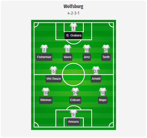 Wolfsburg are likely to start in a 4-2-3-1 formation under Bauer, with Grabara behind Fischer, Vavro, Jenz, and Zehnter. Souza and Arnold will provide cover in front of the back four, giving Eriksen the space to dictate the tempo between the lines, flanked by Wimmer and Majer. Amoura looks the most likely option up front.