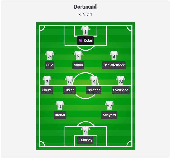 Kovac is likely to rely on a 3-4-2-1 formation again, with Kobel behind a back three of Süle, Anton, and Schlotterbeck. Couto and Svensson would probably provide width as wingbacks, while Özcan and Nmecha would form the double six. In the half-spaces, Brandt and Adeyemi are likely to set the pace behind Guirassy, who will serve as the target man. The big catch is availability, as Can and Mane are out and Sabitzer is still missing, leaving the midfield thinner than usual. This makes Özcan, who is set to be added to Dortmund’s Champions League squad, an obvious stabilizing force in midfield. If Kovac wants to play it safe, Ryerson or Bensebaini could be used in defense, with Beier or Silva options to tweak the front three.
