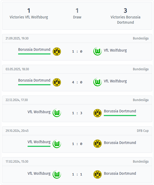 Wolfsburg – Dortmund Head-to-head comparison & statistics