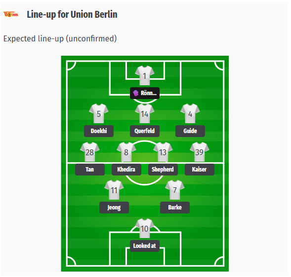 Union va juca, conform așteptărilor, în formația 3-4-2-1 a lui Steffen Baumgart. În poartă va sta Rönnow. Linia de trei fundași va fi formată probabil din Doekhi, Querfeld și Leite. Pe flancuri vor juca Trimmel și Köhn. În mijlocul defensiv, Khedira și Schäfer vor forma dubla de mijloc, iar Schäfer, deși a fost nevoit să iasă la pauză în meciul Ungariei cu Portugalia din cauza unei indispoziții, Baumgart intenționează să-l folosească. În atac, Jeong și Burke sunt așteptați în spatele vârfului Ansah. Ansah este în prezent cel mai bun marcator al Unionului, cu patru goluri, și revine după o victorie cu echipa U21. Burke a fost bolnav la începutul săptămânii, dar s-a întors la antrenamente. Nu sunt disponibili Juranović și Skov (ambii cu leziuni la gambă), Burcu (operație la gleznă) și Markgraf (fractură de oboseală).
