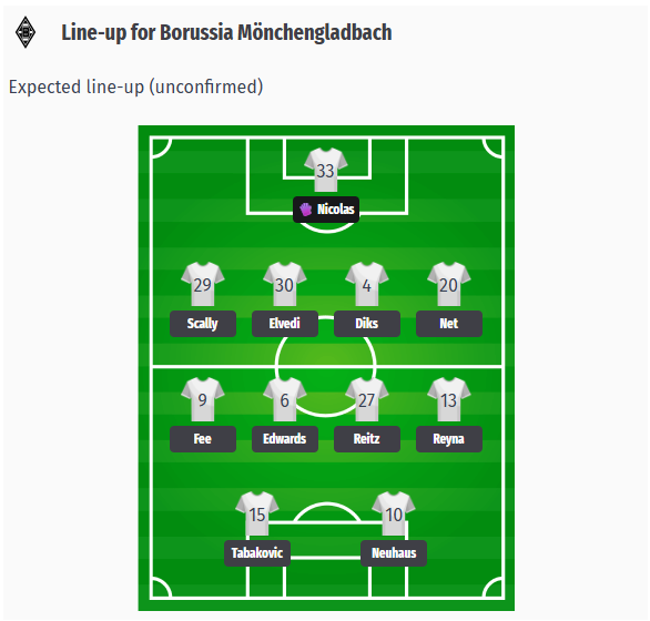 Antrenorul Eugen Polanski va păstra probabil în mare parte formația actuală, 4-4-2. Problema atacului rămâne deschisă: Tim Kleindienst va lipsi cel puțin patru săptămâni din cauza unei leziuni la menisc, iar Tabakovic ar putea fi preferat în primul moment în locul talentului U23 Jan Urbich, deși Urbich a marcat de două ori în meciul amical. La mijlocul terenului, Reyna ar putea oferi un impuls suplimentar alături de Neuhaus. În apărare, Elvedi și Diks par să fie titulari ca fundași centrali. Robin Hack (ruptură de menisc), Nathan Ngoumou (ruptură de tendon Achilles) și Fabio Chiarodia, accidentat, sunt în continuare indisponibili. Wael Mohya, în vârstă de 16 ani, s-a întors după o ruptură parțială a ligamentului interior, dar va începe probabil pe banca de rezerve.