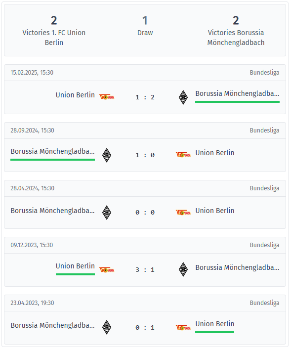 H2H 1. FC Union Berlin – Gladbach Comparație directă & statistici